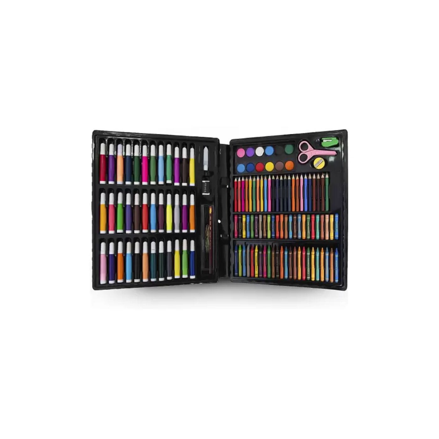 Esse conjunto contém: 12 aquarelas, 1 pincel, 24 gizes de cera, 24 bastões de cera, 24 lápis de cor, 36 canetinhas, 1 apontador, 1 cola, 1 borracha, 23 clips, 1 tesoura, 1 régua e 1 grampeador