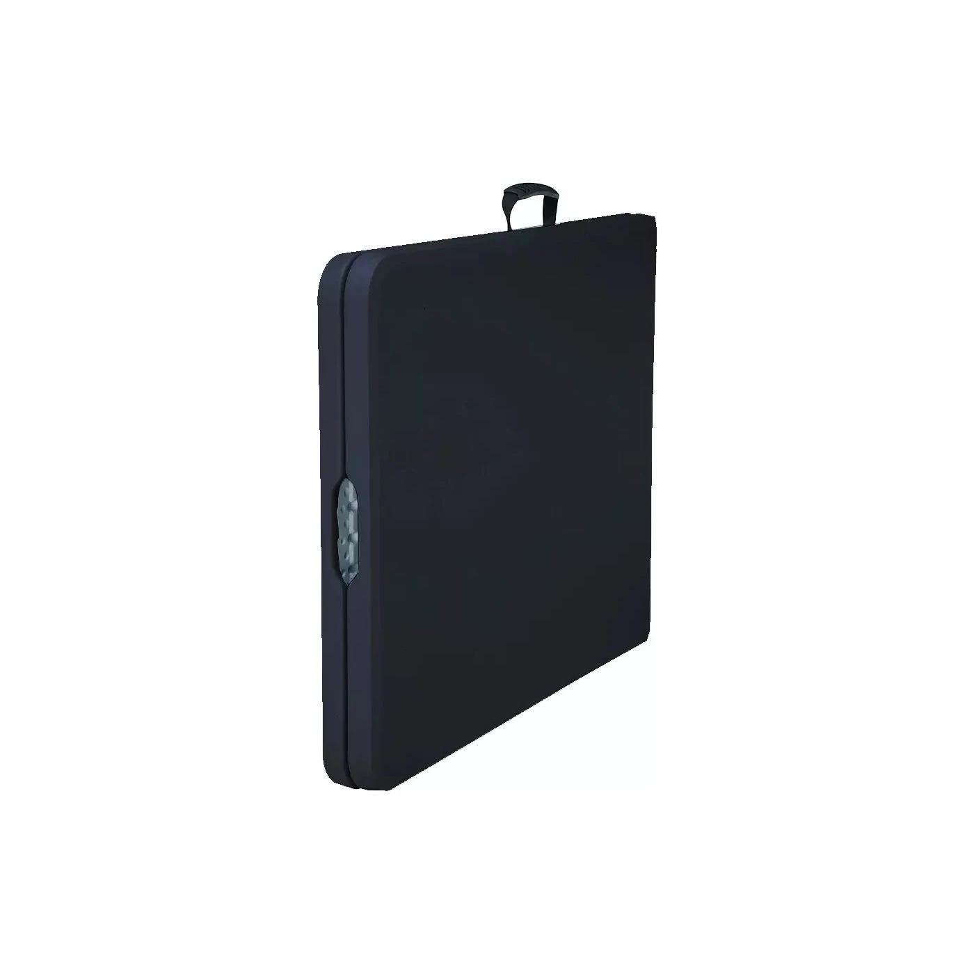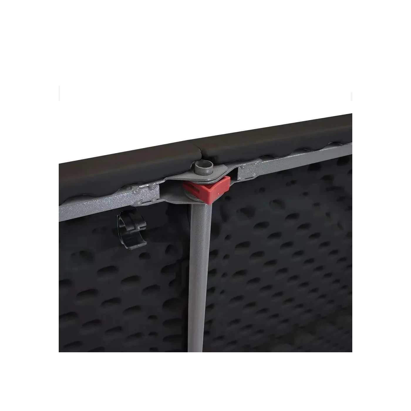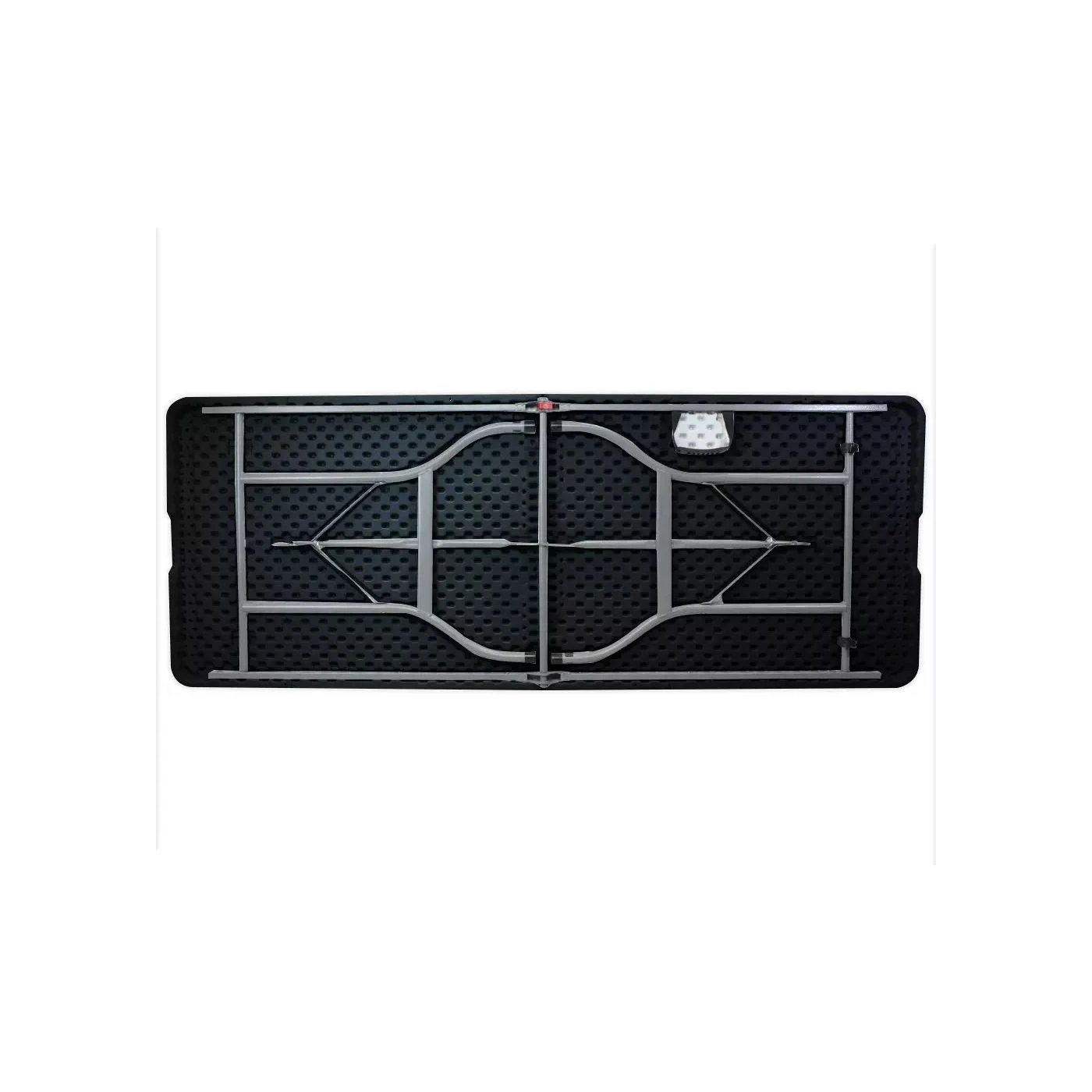 Confeccionada em polietileno de alta densidade, a mesa é durável e confiável. Uma trava de segurança mantém o tampo estável durante o uso, e os pés possuem acabamento emborrachado anti-deslize, garantindo estabilidade em diversas superfícies.