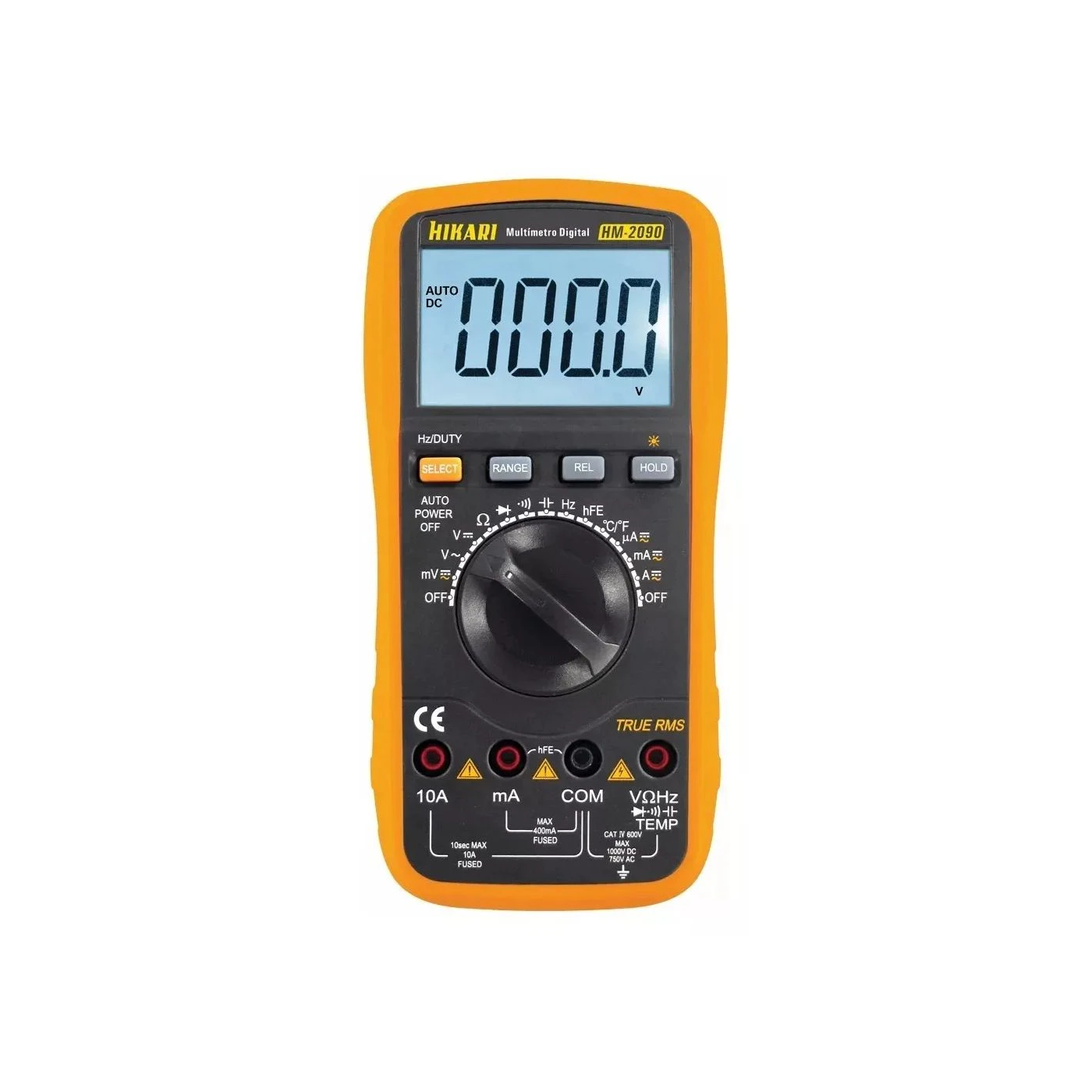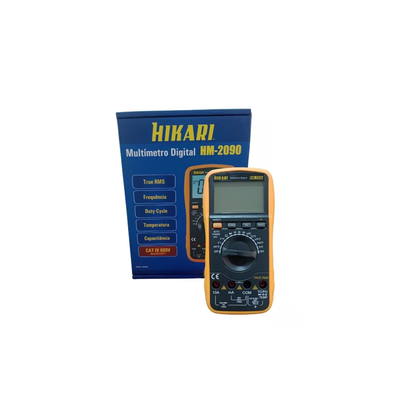 Multímetro Digital HM-2090 Hikari, instrumento digital portátil TRUE RMS, com LCD de 3 ¾ dígitos com iluminação, de acordo com a categoria IV 600V de segurança, holster protetor, congelamento de leitura, modo relativo, desligamento automático e mudança de faixa automática. Realiza medidas de tensão DC e AC, corrente DC e AC, resistência, capacitância, freqüência, duty cycle, temperatura e testes de diodo e continuidade.