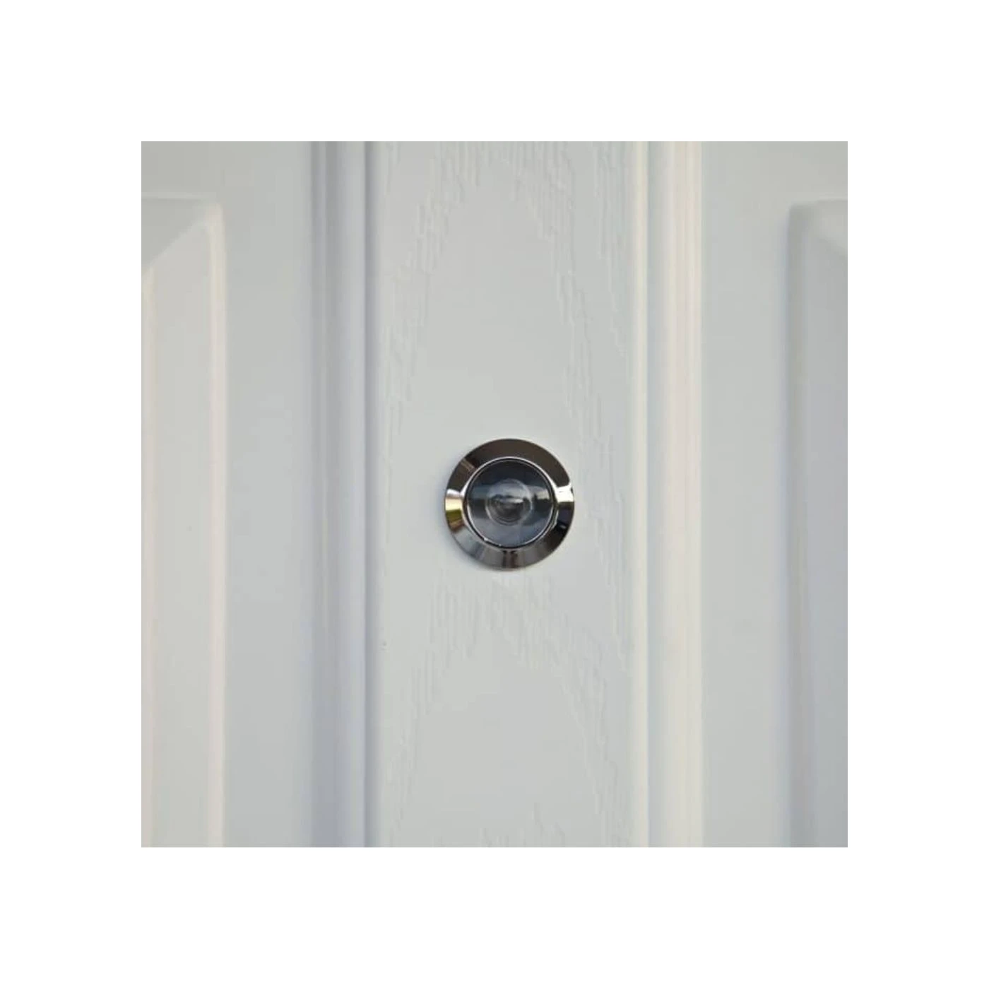 Olho mágico resistente e de alta qualidade, ideal para portas residenciais. Modelo ajustável para espessuras de 26 a 46 mm, com corpo em acabamento cromado. Fabricado pela Pado, referência em segurança.