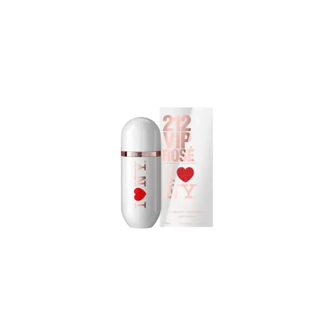 Frasco 212 VIP Rosé aparece com um exterior branco brilhante, apresentando o clássico logo I ?? NY em rosa metálico com um lindo coração de glitter vermelho.