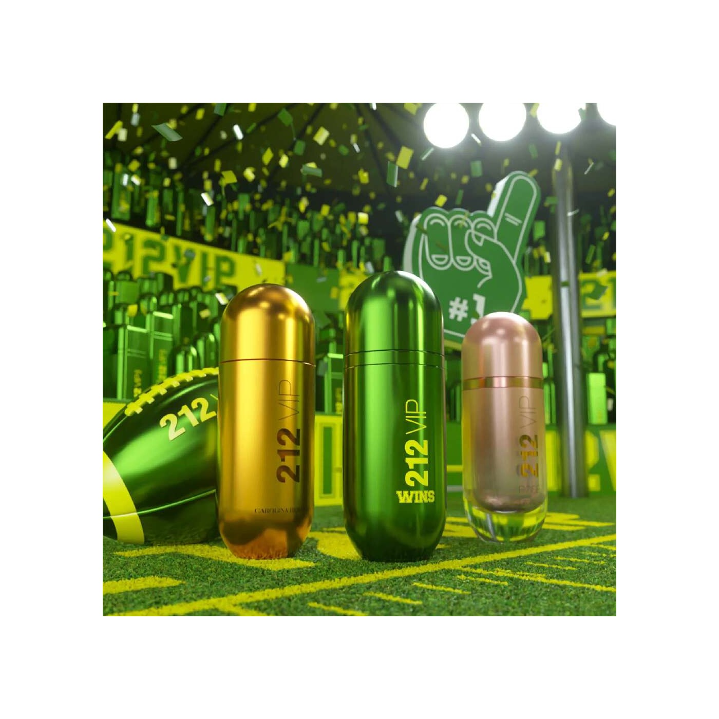 » O perfume é apresentado no mesmo frasco curvo e icônico de 212 VIP, agora em um tom verde metálico elegante, inspirado nos campos de futebol americano e nos ingredientes aromáticos à base de plantas contidos em sua fórmula 100% vegana. Uma fragrância para vencedores, o 212 WINS inspira você a perseguir seus sonhos e vencer todos os desafios com elegância e resiliência.