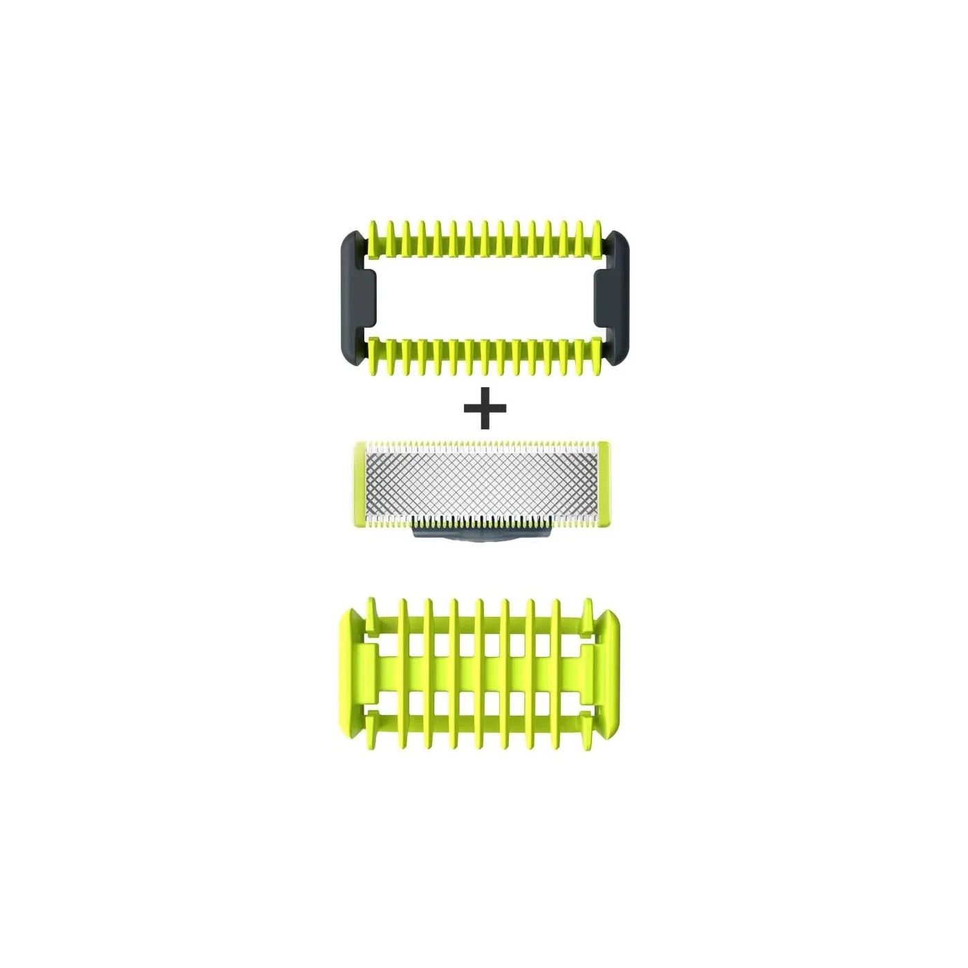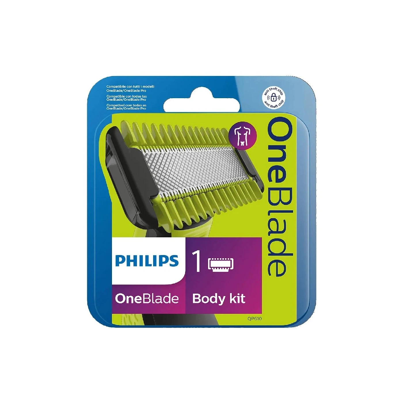 Este kit de substituição inclui uma lâmina para o corpo com uma proteção de encaixe para a pele e um pente para pelos corporais. Esqueça a utilização de vários aparelhos, a OneBlade faz tudo!